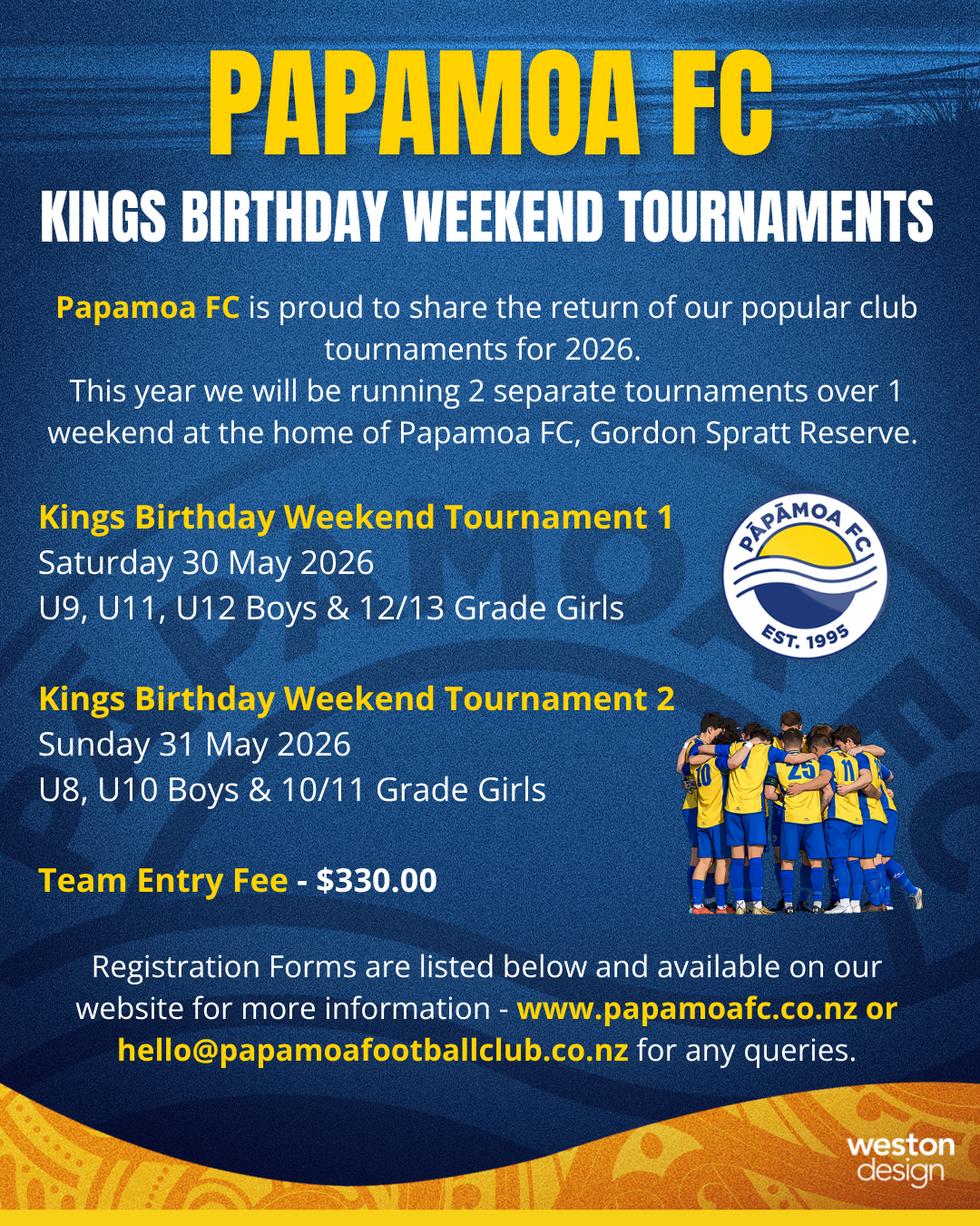 Papamoa FC will again be hosting our popular junior tournaments in 2026. These tournaments provide the opportunity for a wide variety of teams from across New Zealand to participate and play new teams.